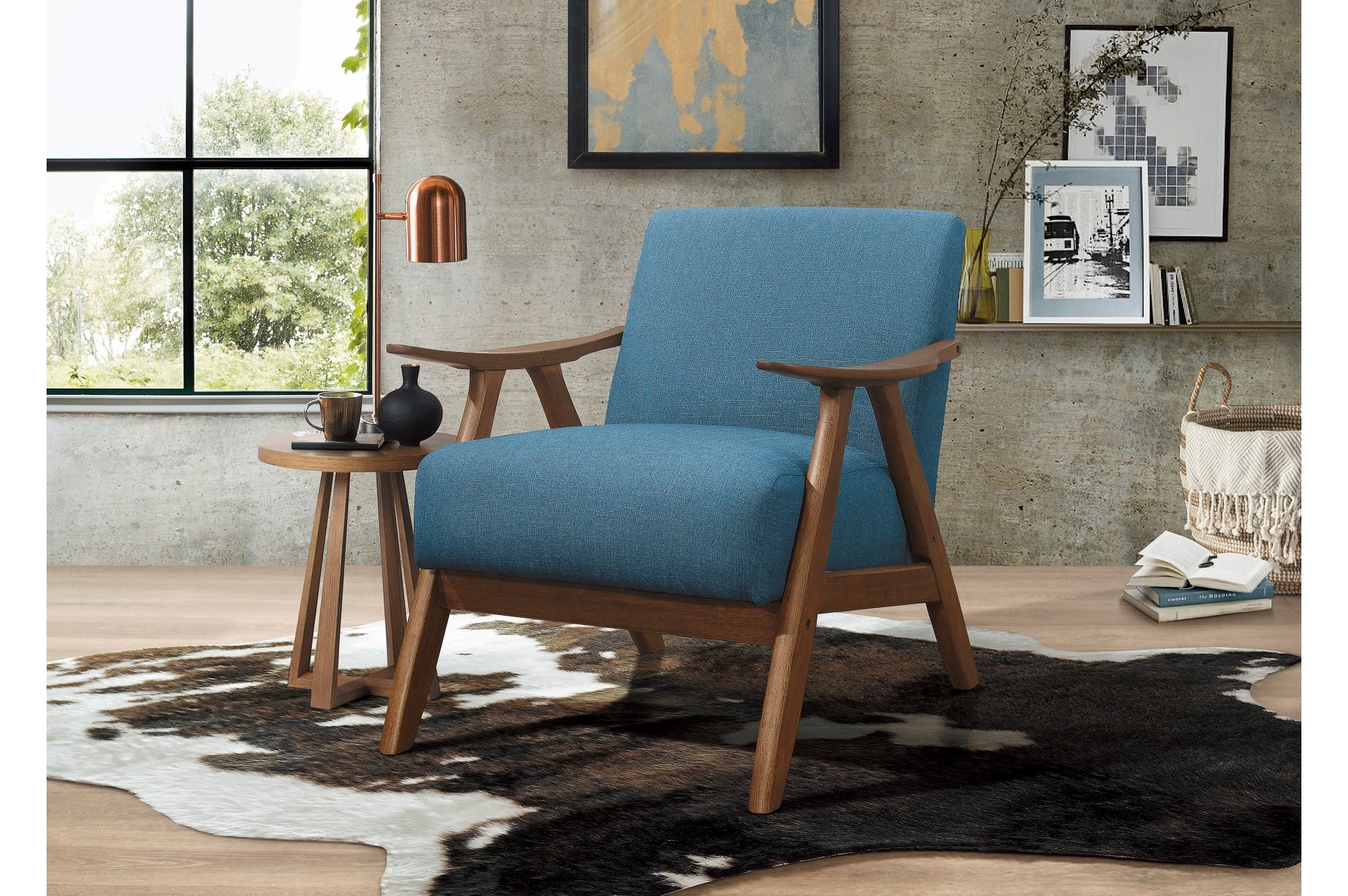 The retro-inspired wood framing of the Damala Collection will perfectly accent your modern home décor. Subtle contouring to the seating collection’s wood frame is finished in walnut, presenting as a classic complement to the blue fabric that covers the padded seats and backs of the sofa, love seat and chair.
