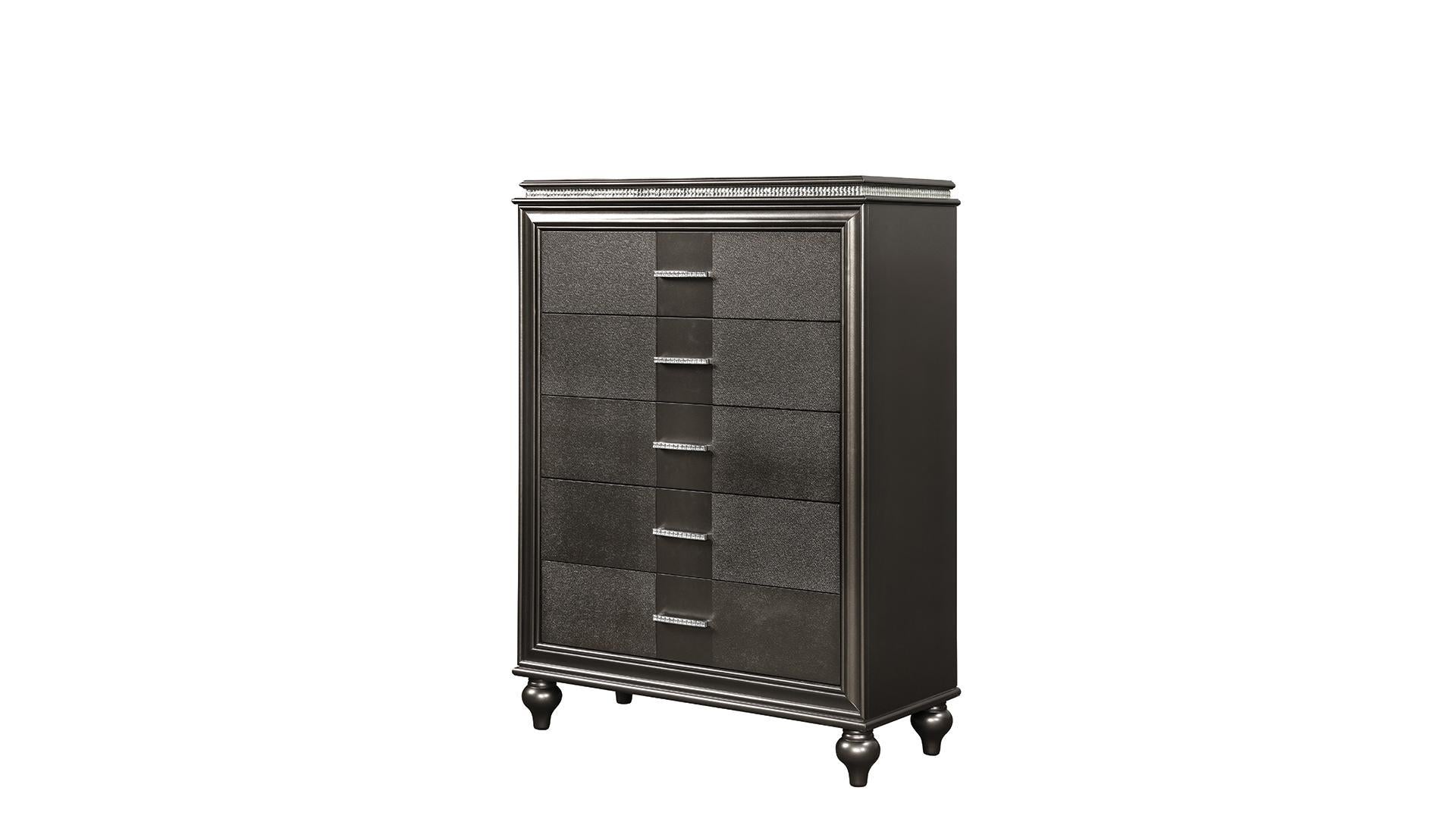 This bedroom has a luxurious Hollywood glam design. It has a rich gunmetal copper finish, all cases comes with bevelled mirror accent that carries on to the hardware. The headboard and mirror has LED accent that adds to the beauty of the bedroom set, all drawers are with ball bearing gilds. The legs of the bedroom set has spindle design that ties into the look of the bedroom. The dresser has hidden velvet lined jewellery drawers and all the top drawers are felt lined.