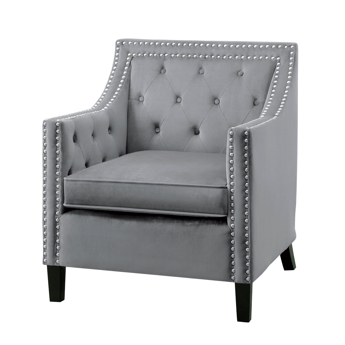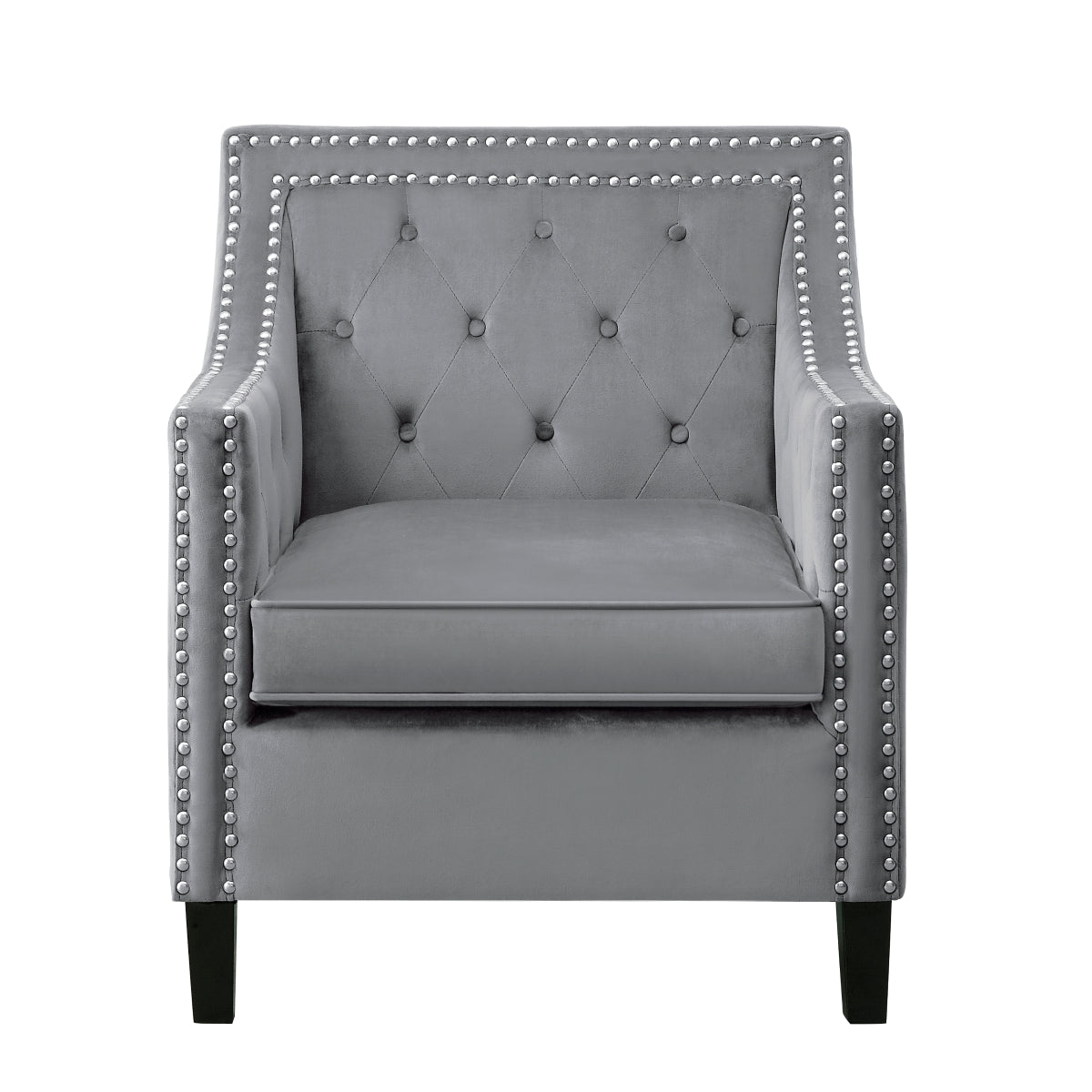 Traditional Accent Chair Collection featuring tufted back and nail head accents. Offered in Blur or Grey Fabric