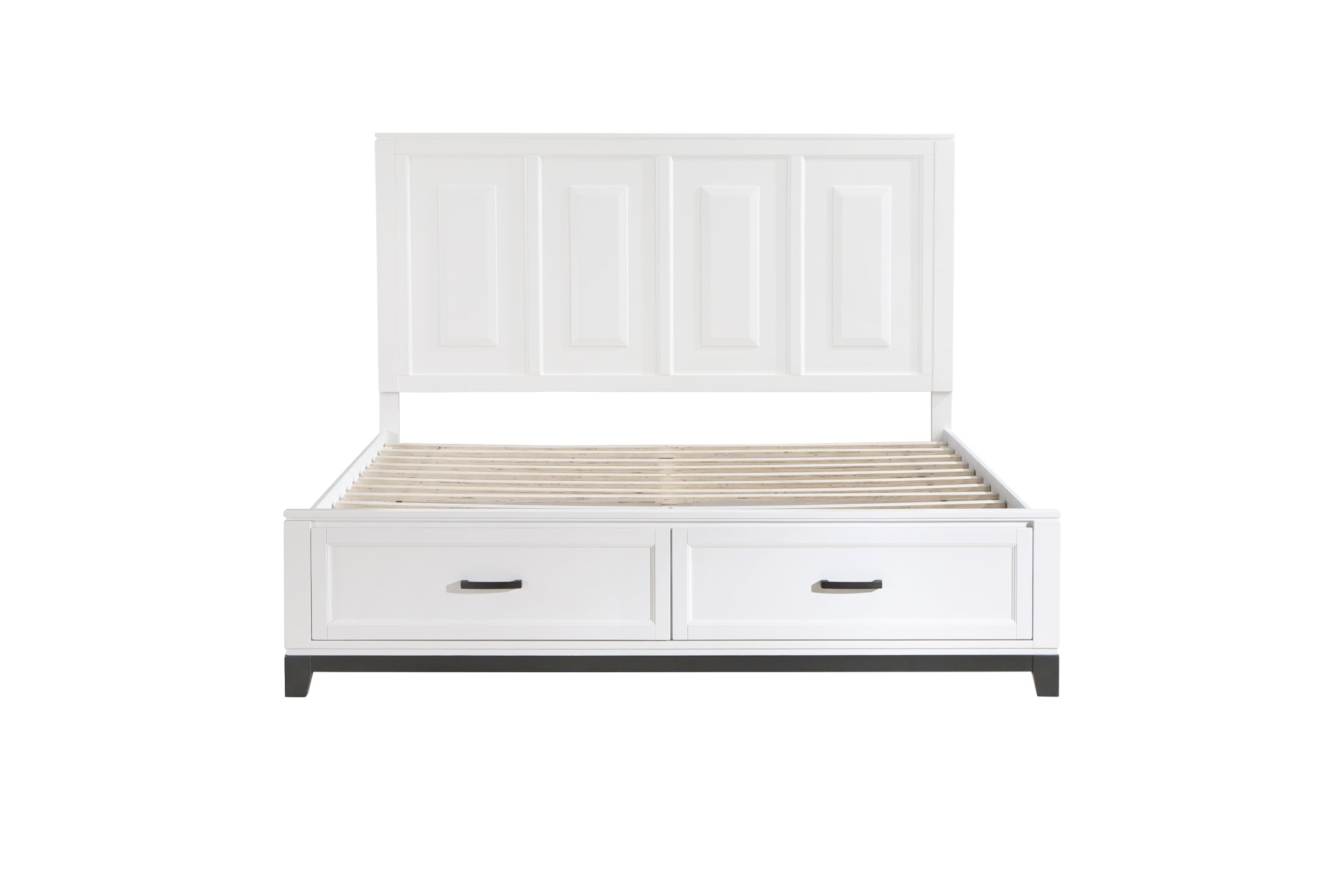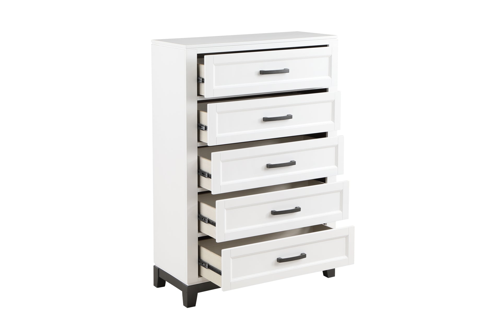 The Garretson Collection blends transitional lines with rustic styling to create an elegant addition for your bedroom. The collection features a white finish and contrasting black finish base rail. Metal bar hardware fronts the picture frame drawer fronts of the storage footboard, dresser, mirror, and chest. The drawer of the twin-size low-profile footboard creates additional space within your room for soft good storage. Two optional bookcases – 4-place and 6-place – are available as is a coordinating student desk.