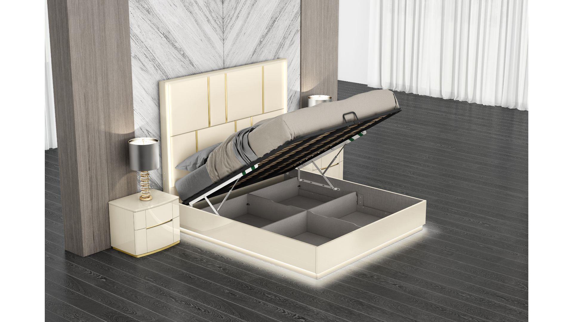 Featuring a convenient lift-up bed with storage mechanism, this piece makes organization effortless with easy access to its storage compartment. The smooth lacquer finish provides a sleek, modern appearance, while the integrated LED headboard enhances the ambiance. The beige lacquer and titanium gold finish create a sophisticated and luxurious look, complemented by a plush PU headboard for added comfort and an upscale aesthetic. Neutral beige tones and metallic accents ensure this piece complements a wide range of bedroom decor styles