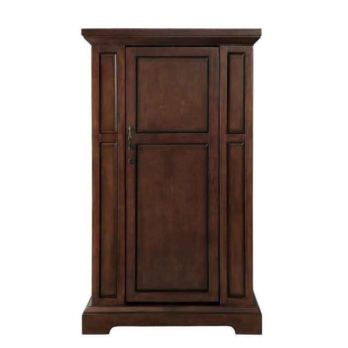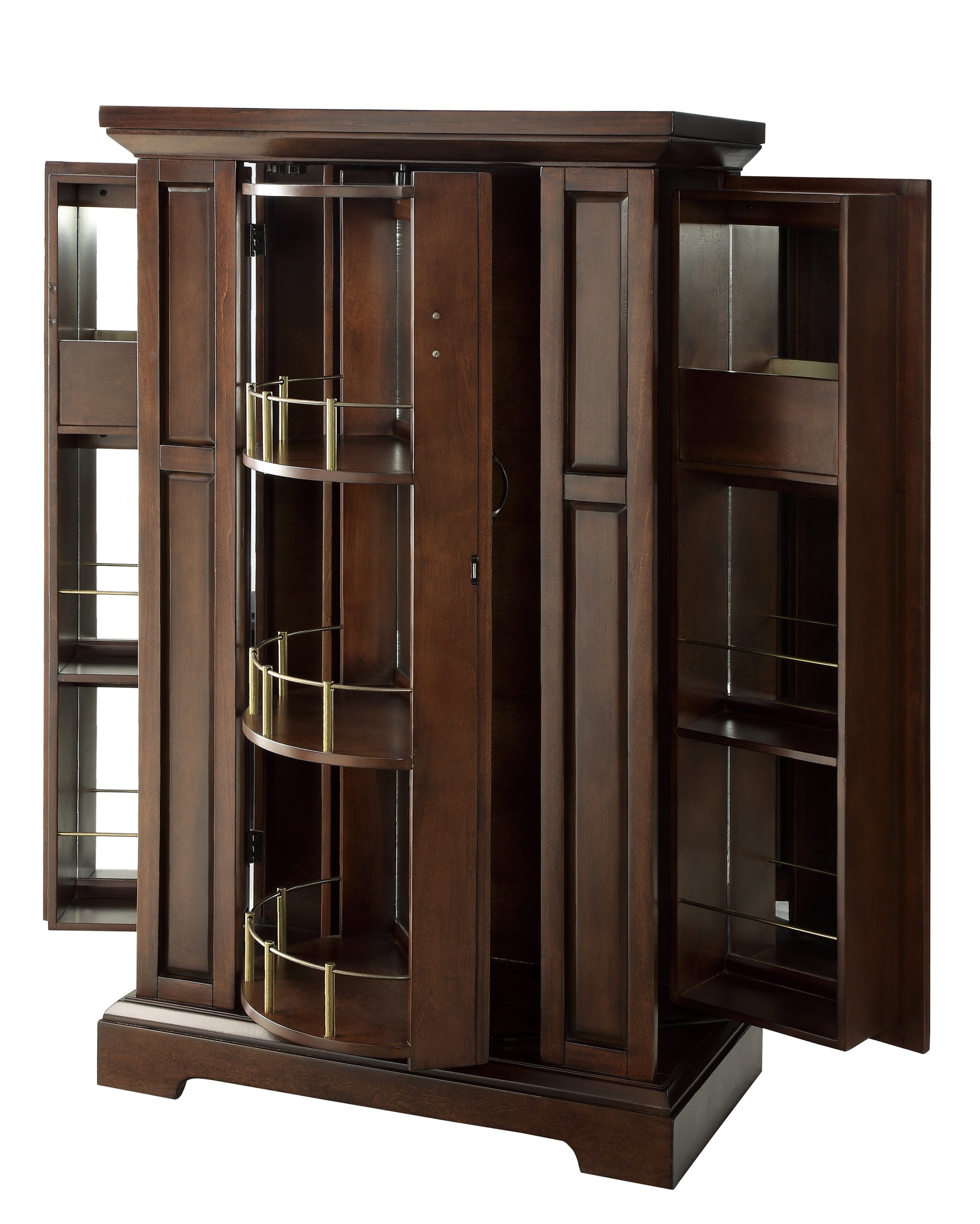 Secure and discrete storage of your bar items is achieved with the unique design of the Snifter Collection. When the main center cabinet door is unlocked, it opens – in one smooth motion - to reveal hidden side cabinet storage. Each shelf reflects its contents with the aid of mirrored backs. Metal shelf support railings provide peace of mind that the cabinet’s contents will not shift when the unit is opened. Transitional styling combined with a cherry finish lends to placement in a number of home environments.