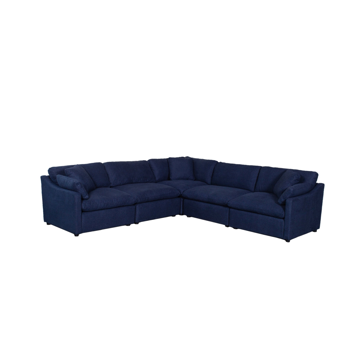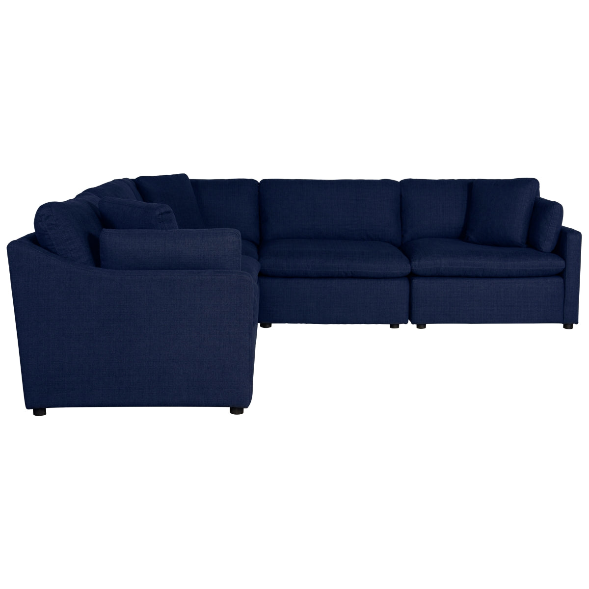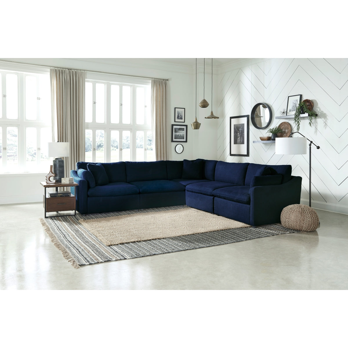 Enveloping your body as you relax into its ample seating, the Howerton sectional collection provides an inviting platform for your downtime. Softly textured dark blue fabric covers this modular sectional seating option, allowing for decorative flexibility within your environment. Loose back cushions and three coordinating toss pillows lend to your ultimate comfort. The sloped arms create subtle contrast to the straight lines of the sectional’s profile. Coordinating ottoman also available. Also available in grey or beige fabric.