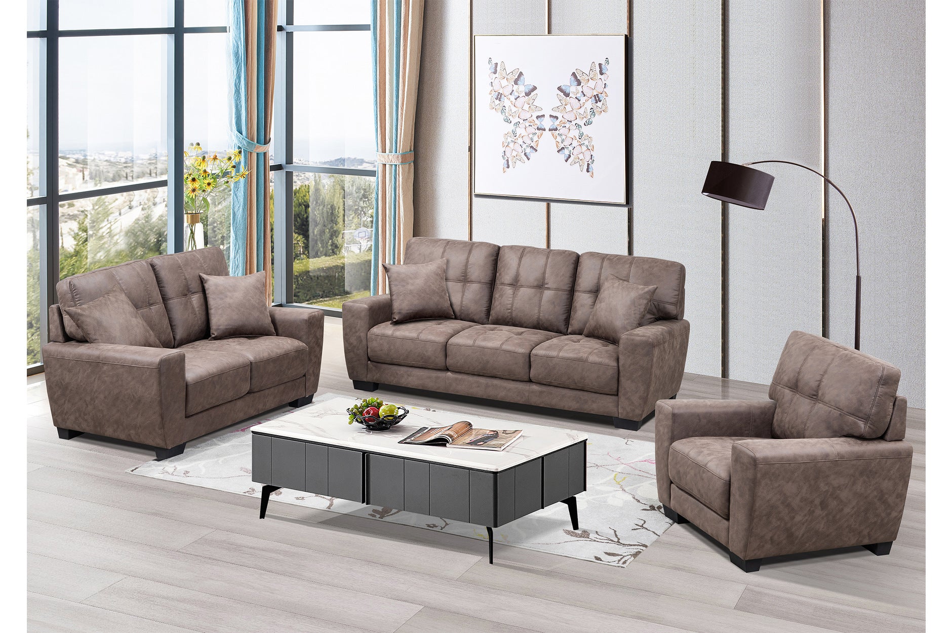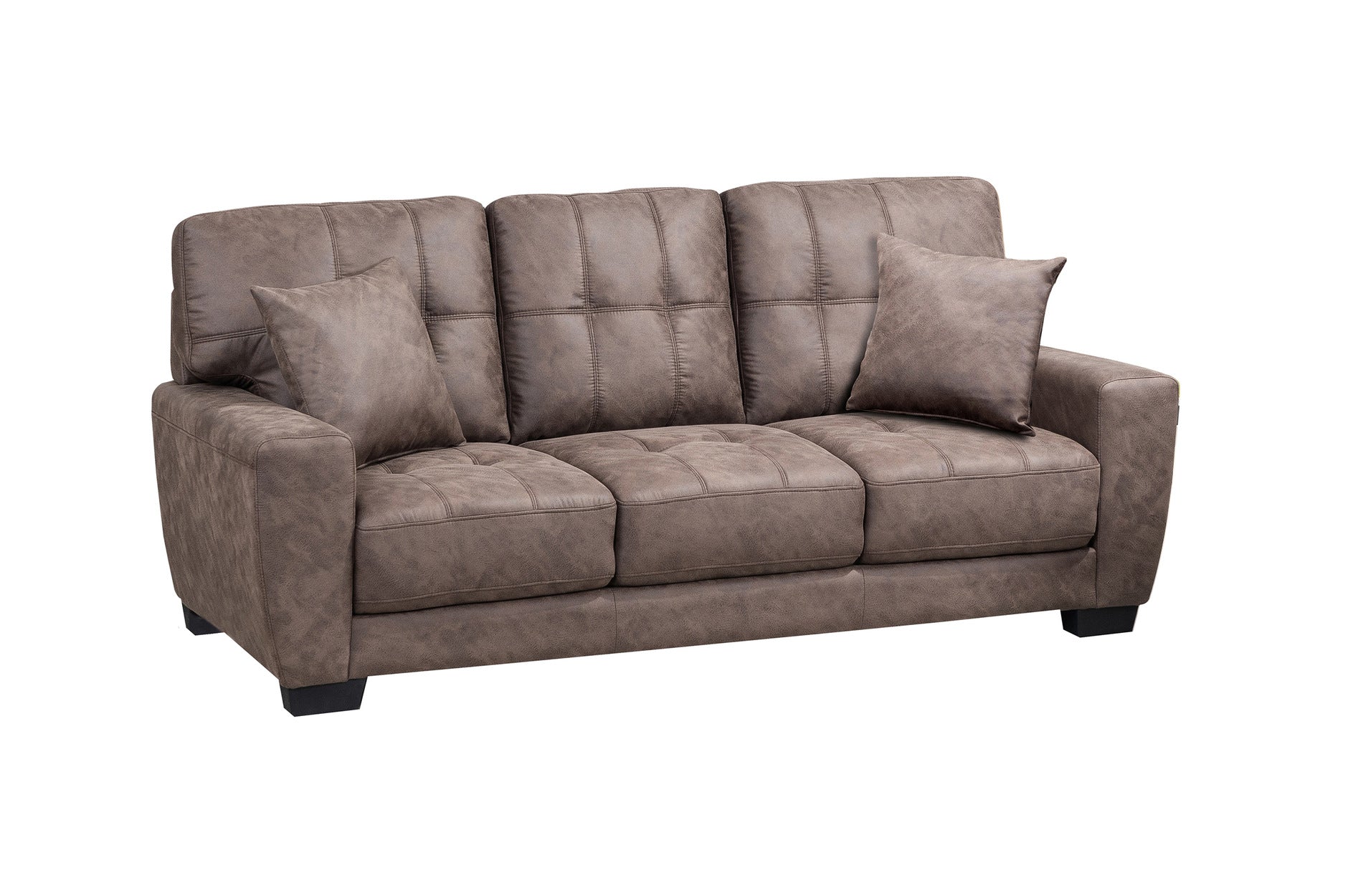A plush design with a rounded profile is the hallmark of the Misha seating collection. With the sophisticated look of brown textured leather, polished microfibre upholstery deceives the eye until you snuggle in and realize the ultra-comfortable fabric has a soft hand feel that is as cozy as can be. Your relaxation will be even more complete as wide-track arms combine with thick back and seat cushions, not to mention extra support provided by two matching square pillows. The Misha collection's appearance is capped by low exposed wooden legs and double-stitched biscuit tufting, ensuring your living room is stylish yet cozy. Also available in grey.