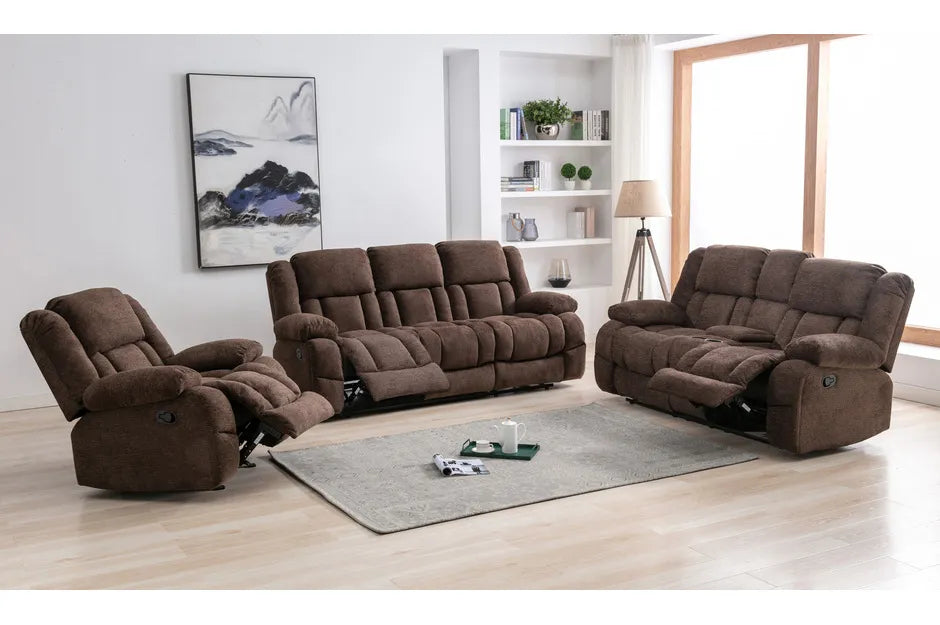 With an invitingly rounded profile, the Presley reclining collection is the sofa equivalent to a warm hug. Swathed in appealingly soft brown chenille fabric with generously stuffed cushions and outrageously plump pillow armrests, the Presley collection beckons you to a state of total relaxation. Double tab-pull latches allow you to stretch out and recline while stitching details provide some shape to this cozy set. The loveseat's central console features lift-top storage and cupholders as an additional element to keep you comfortable. With dense foam padding over coil seat construction, you are guaranteed seating comfort and shape retention over time, ensuring that sinking into the Presley collection will be a pleasure time and time again. Also available in grey chenille; also available as a modular sectional.