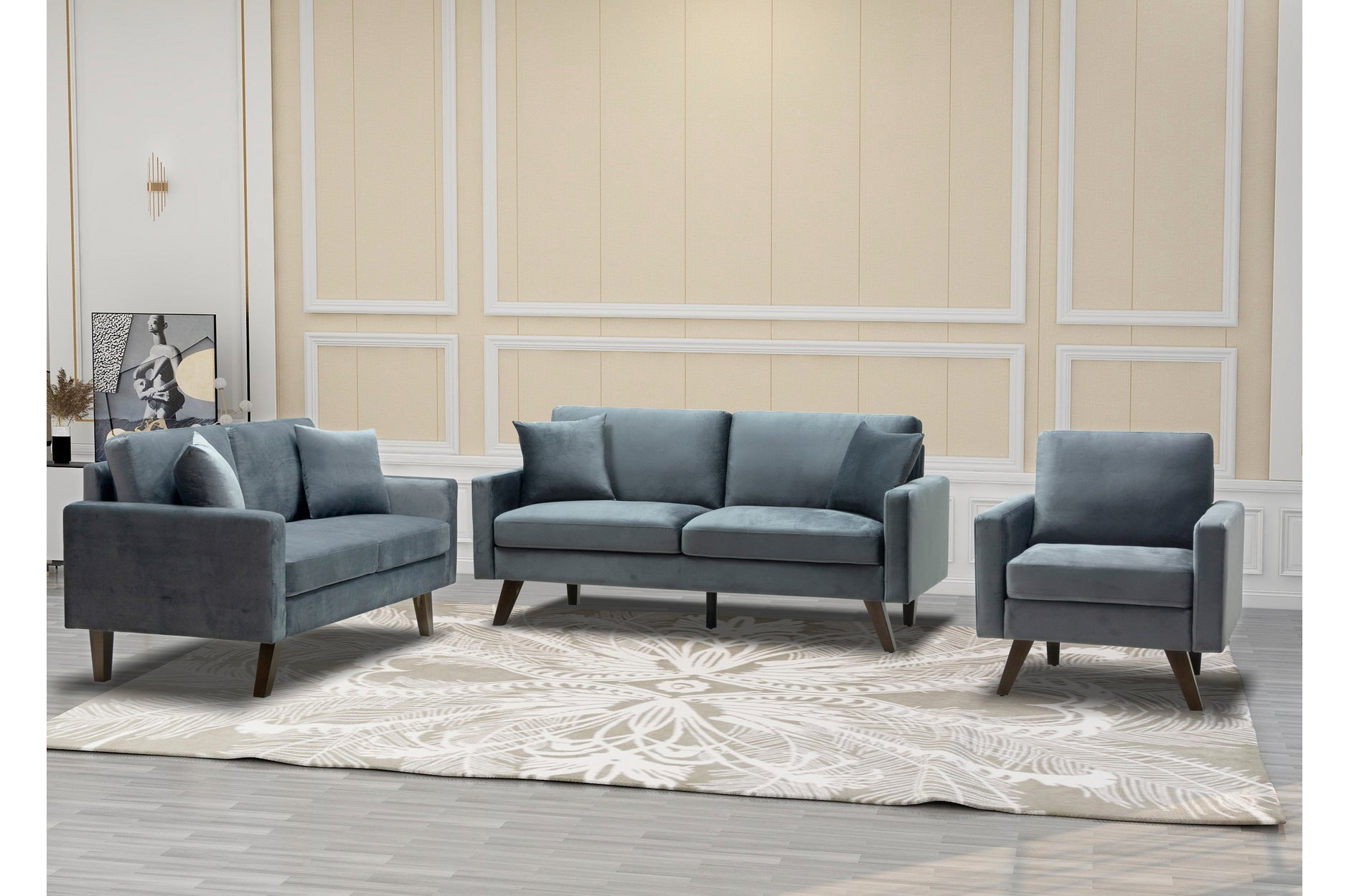 The Bellerophon seating collection is cozy, stylish, and looks at home in a number of décor settings. The union of straight lines atop flared walnut hardwood legs with thick foam padded cushions ensures a clean silhouette with comfort to match. Meanwhile, plush blue velvet upholstery makes a wonderful statement in your room, especially with the matching throw pillows. For a winning combination of amenity and flair, you can't go wrong with the Bellerophon collection.